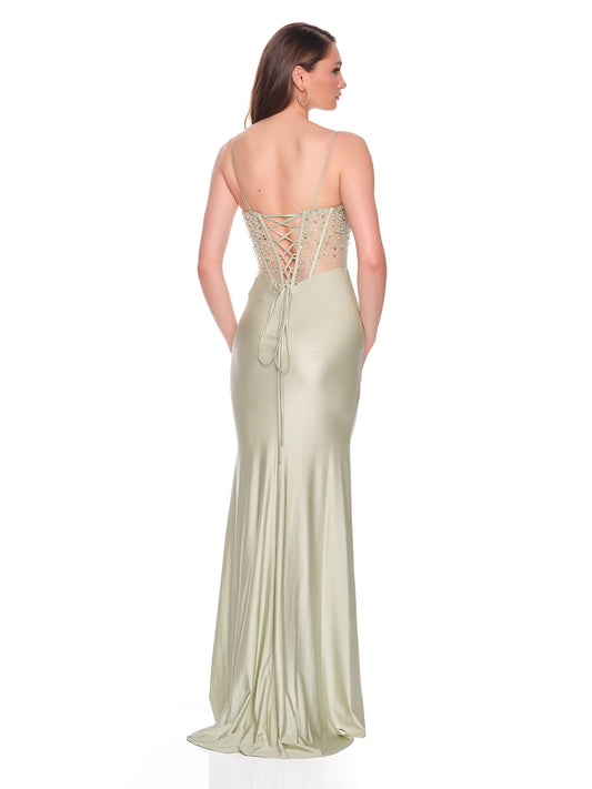 FULLY SEQUIN GOWN WITH BACK ILLUSION PANELS& THIGH HIGH SLIT