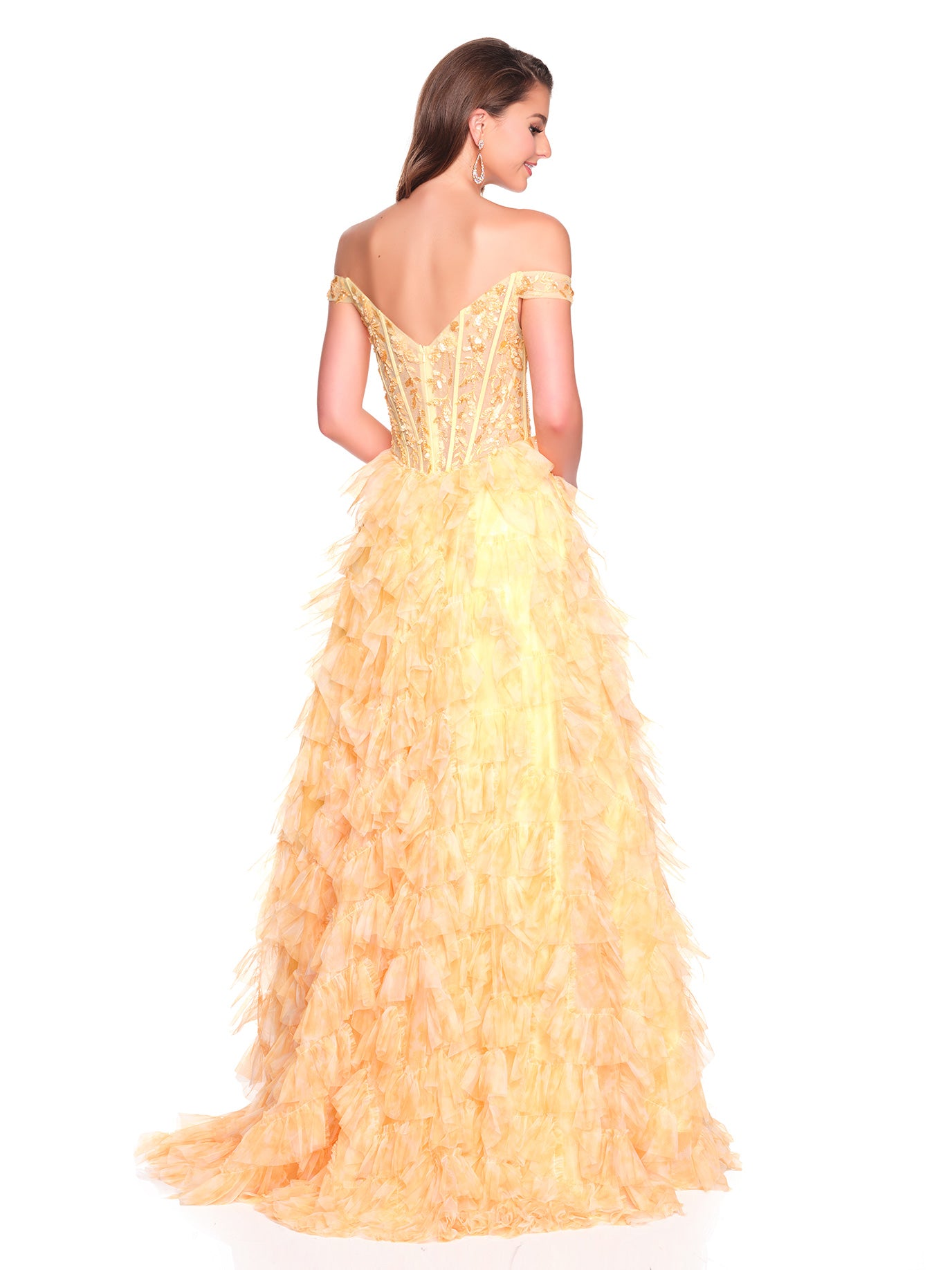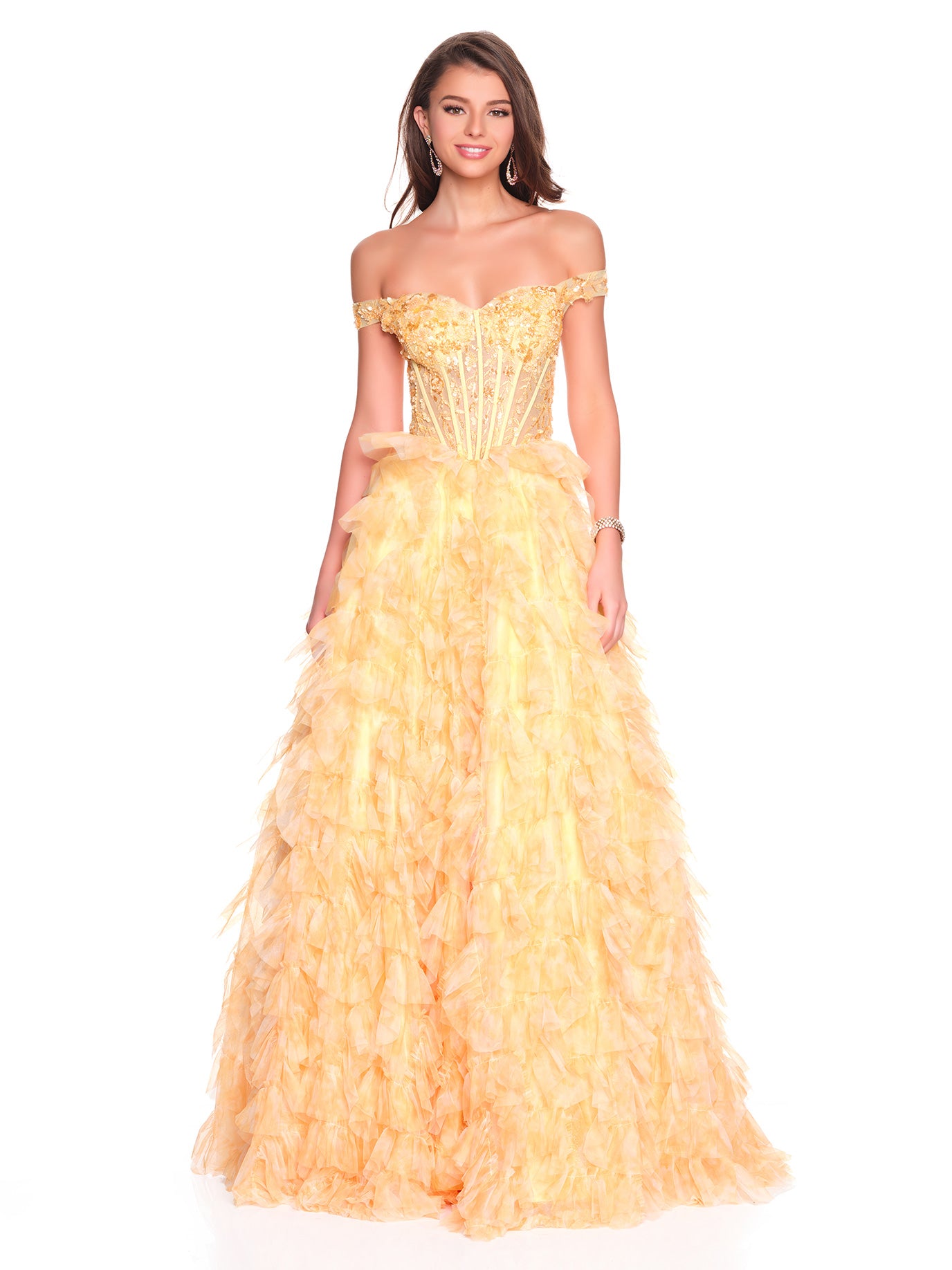 OFF THE SHOULDER PRINT DRESS WITH ASYMMETRICAL RUFFLE SKIRT