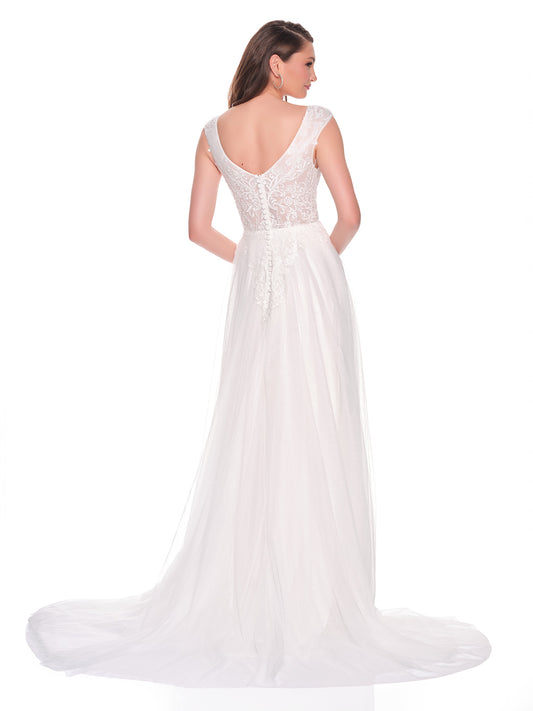 CAP SLEEVE ILLUSION BODICE BRIDAL GOWN WITH FLOWY A-LINE SKIRT