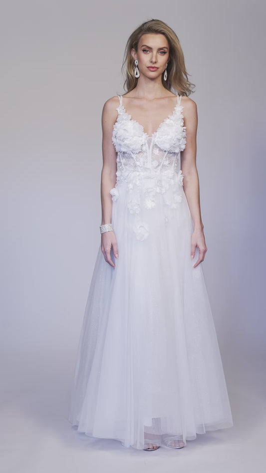 3D FLOWER DETAIL BODICE WITH DOUBLE BEADED STRAP, MESH OVER GLITTER TULLE SKIRT