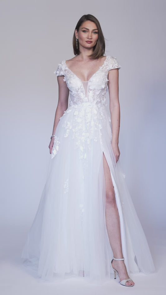 3D FLORAL CAP SLEEVE GOWN WITH TULLE SKIRT