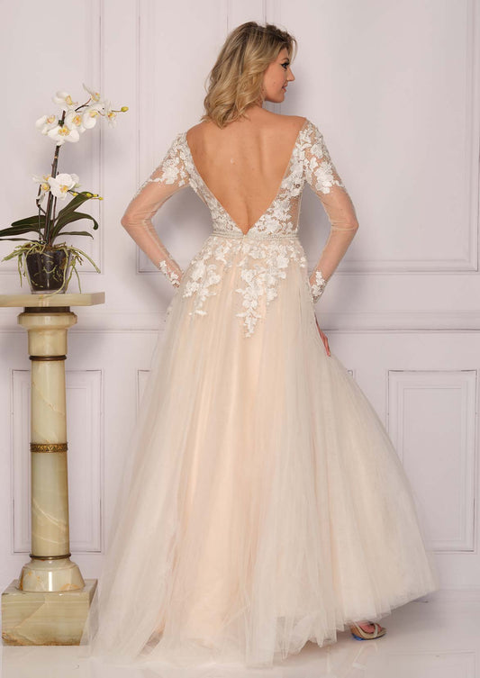 ILLUSION LONG SLEEVE WEDDING DRESS WITH FLORAL APPLIQUES PLUS SIZE