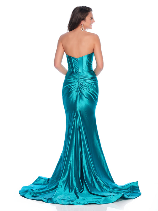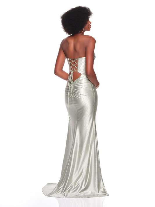 STRAPLESS CUTOUT DRESS WITH STONE ACCENTS AND HIGH SLIT