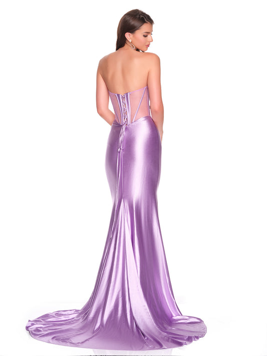 STRAPLESS CHARMEUSE DRESS WITH FITTED SHEER ILLUSION BODICE