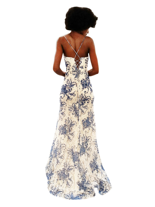 FITTED SEQUIN GOWN WITH EMBROIDERED FLORAL DESIGN AND HIGH SLIT