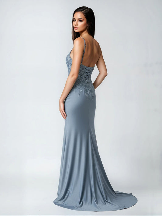 HIGH SLIT DRESS WITH SHEER BODICE AND DOUBLE STRAP DETAIL