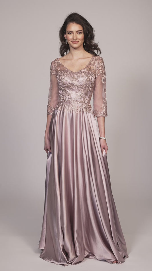 FLOWY STRETCH SATIN GOWN WITH PUFF SLEEVES