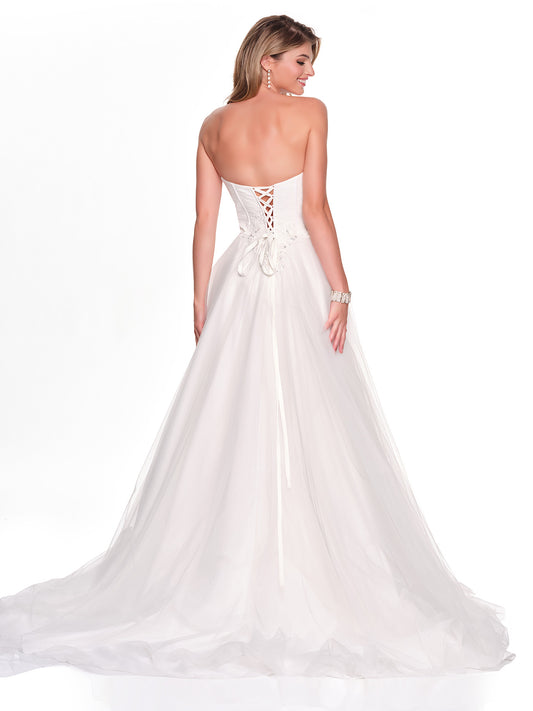 STRAPLESS TULLE BRIDAL GOWN WITH WITH CUT OUT ILLUSION BODICE AND APPLIQUE DETAIL