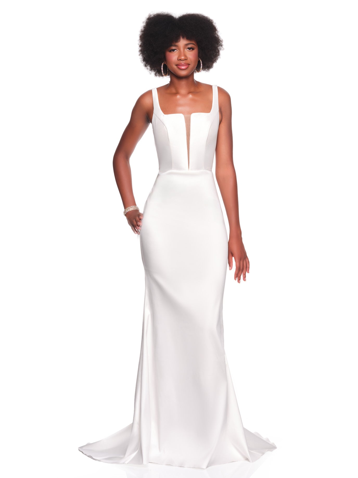 FITTED SATIN BRIDAL GOWN WITH ILLUSION CENTER INSET, SQUARE NECKLINE