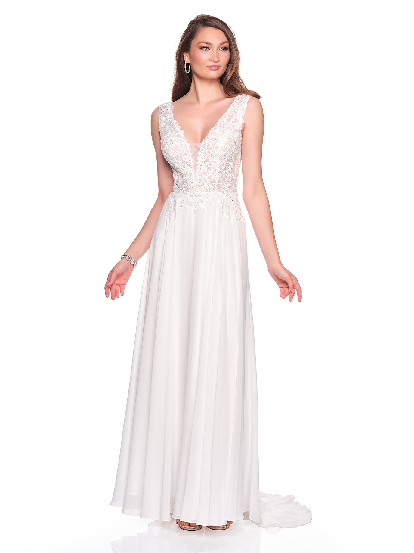FLOWY CHIFFON BRIDAL GOWN WITH DEEP V NECKLINE AND BEADED ILLUSION BODICE